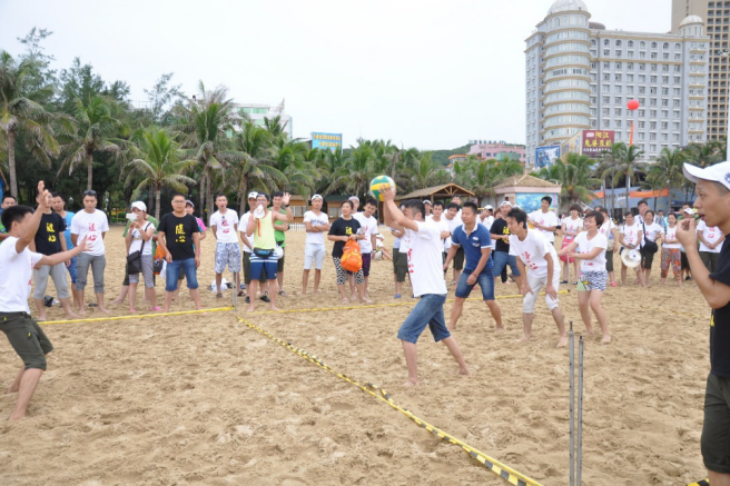 我們在黃金海岸舉行了沙灘排球、拔河、兩人雙足等眾多有利于團建的沙灘娛樂活動??纯次覀兊纳碁┡徘蛘l更厲害,首先姿勢要擺對,聽我口哨準(zhǔn)備發(fā)球啦!啦啦隊們?yōu)槲覀兊木时荣惡炔剩?/span>